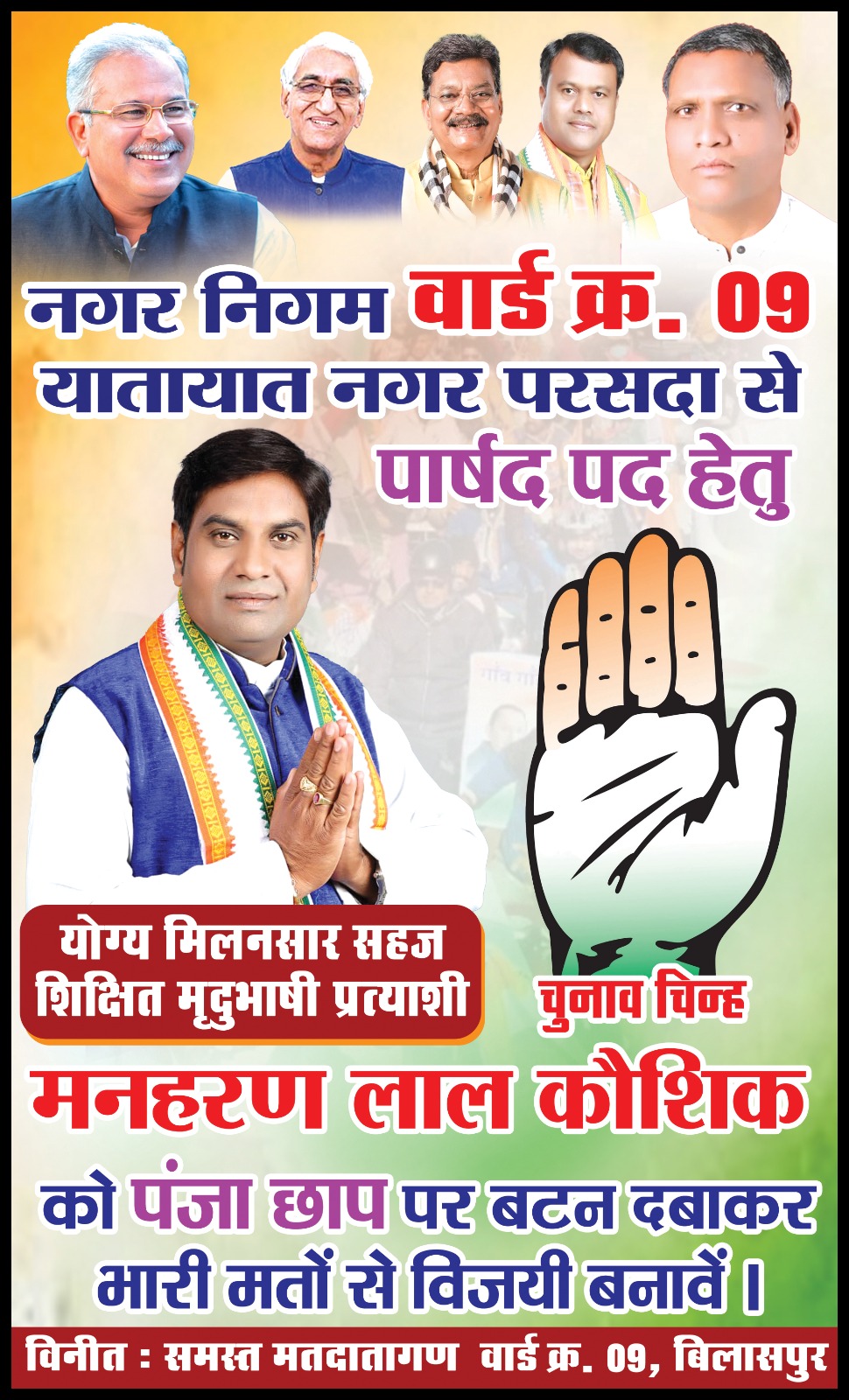 बिलासपुर नगर निगम चुनाव : वार्ड क्रमांक 09 से कांग्रेस प्रत्याशी मनहरण लाल कौशिक के समर्थन मे लहर…